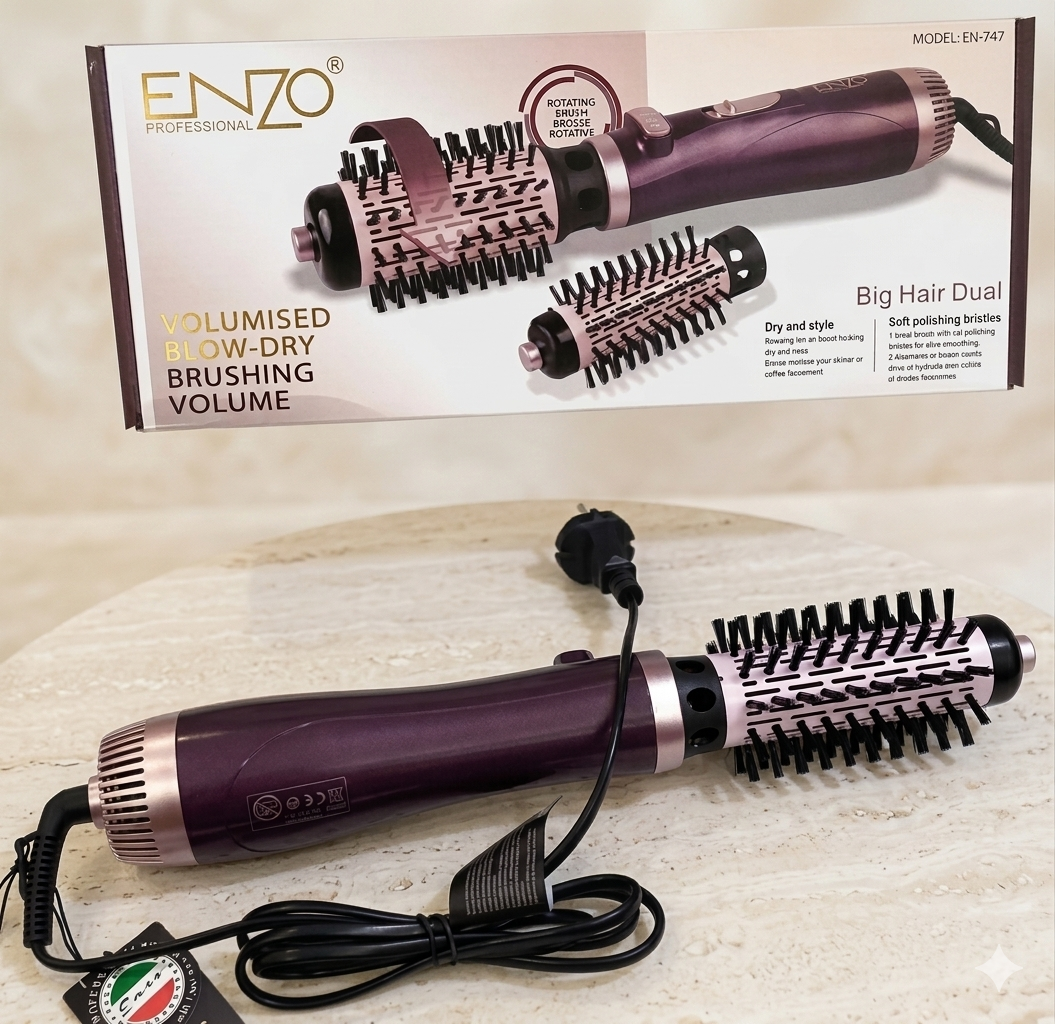 هل تحلمين بشعر ناعم، كثيف، ولامع في دقائق؟ اكتشفي السر مع Brosse Chauffante Rotative Pneumatique من العلامة الإيطالية الشهيرة ENZO (Ref: EN-747).