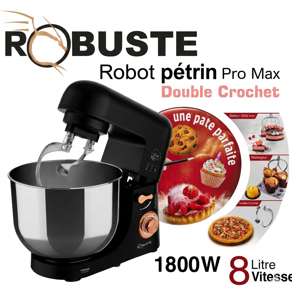 Pétrin Robuste Double Crochets 3EN1 petrin, fouet, batteur, 8L 1800W PRO MAX Noir x123,000 د.ج